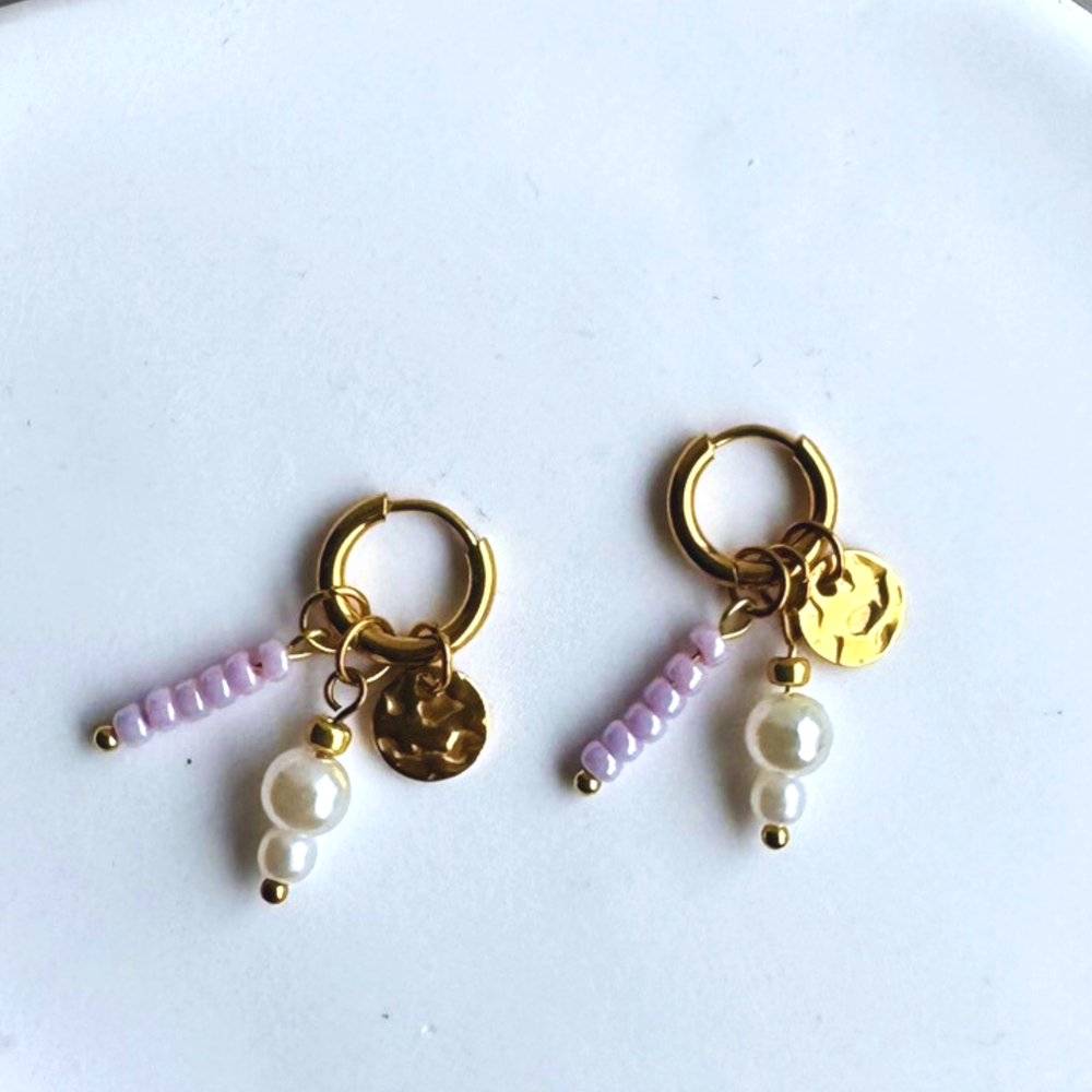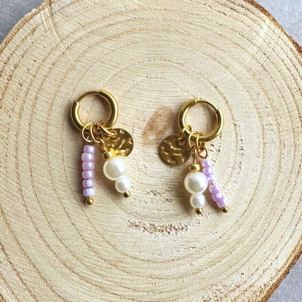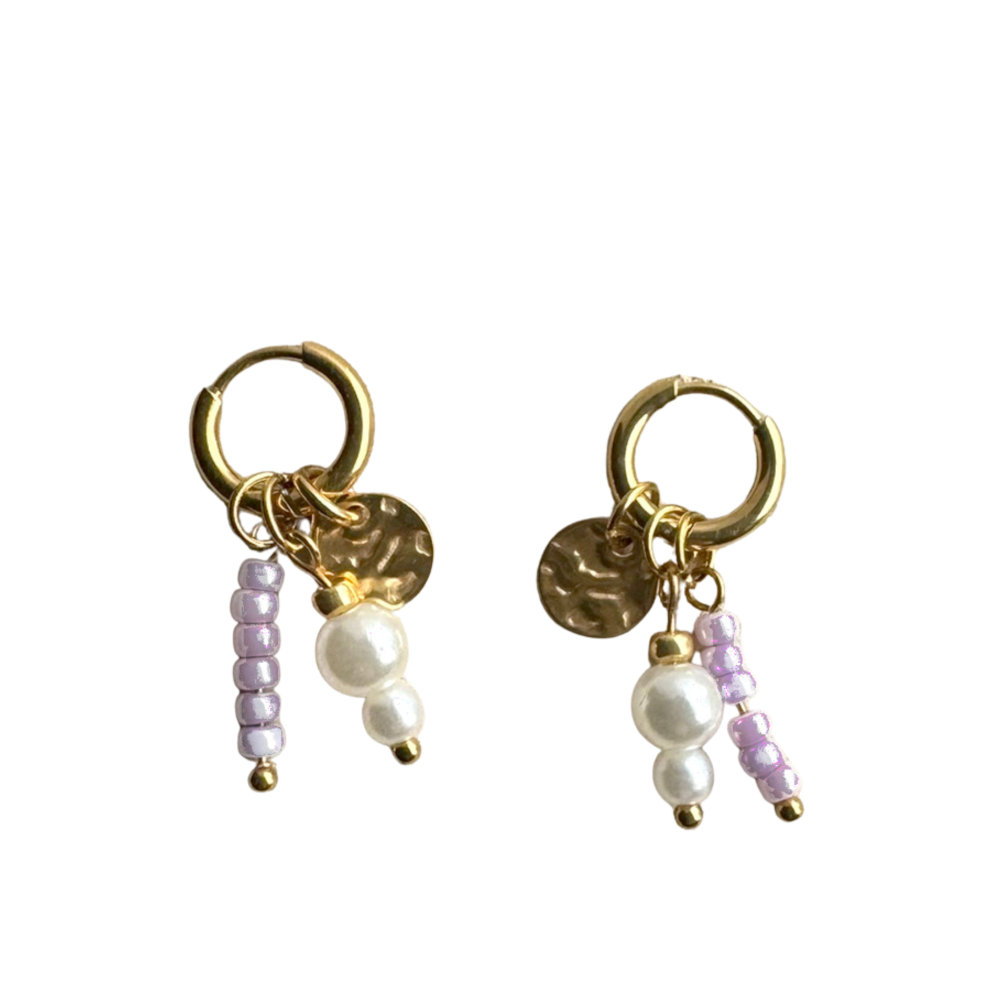 STALEN OORBELLEN GOUD MET LILA KRALEN MYRLE